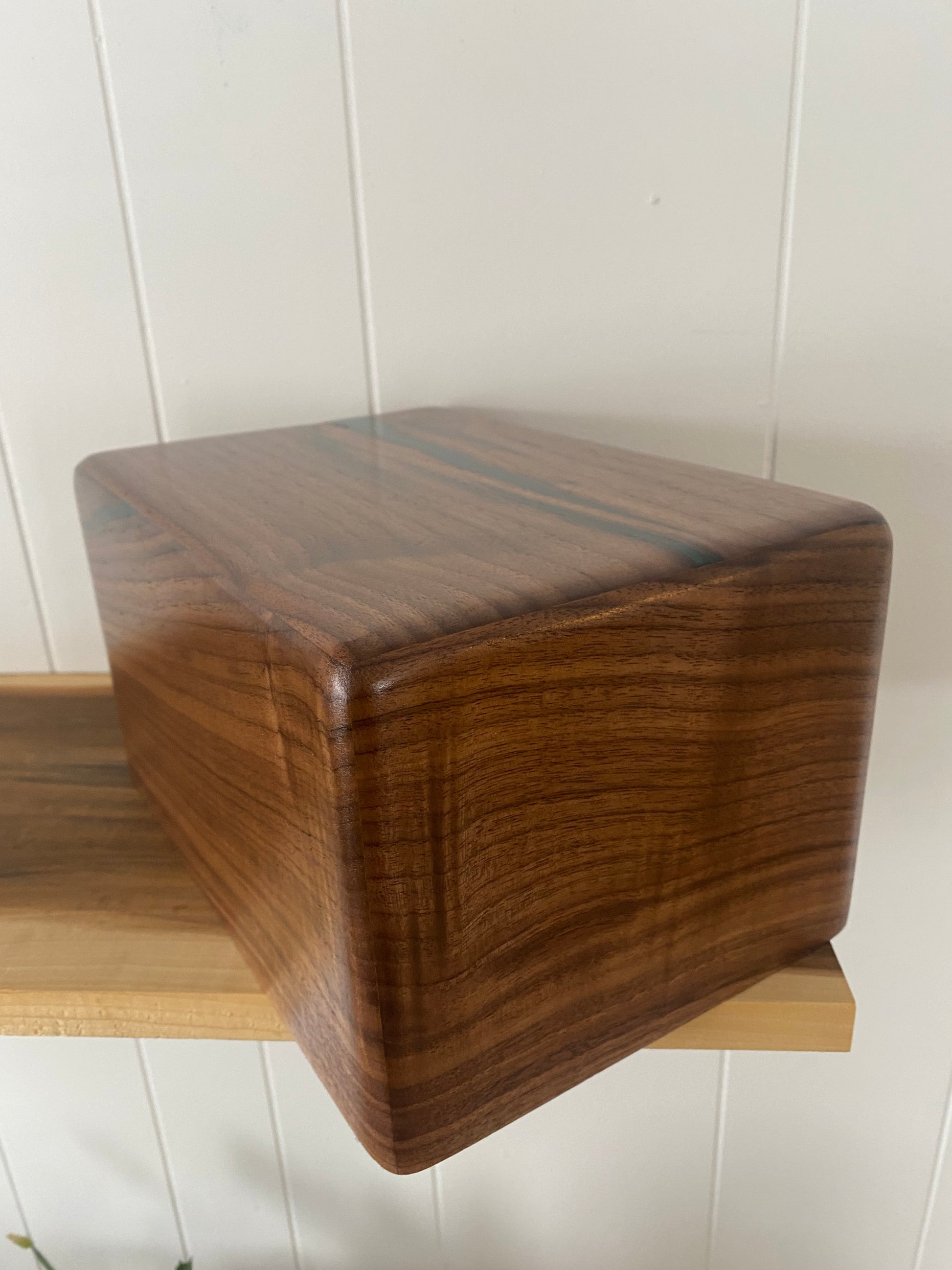 Minimalist Cremation Urn-Black Walnut, green epoxy, imperfect wood, for Adult Human Ashes, up to 250 pounds